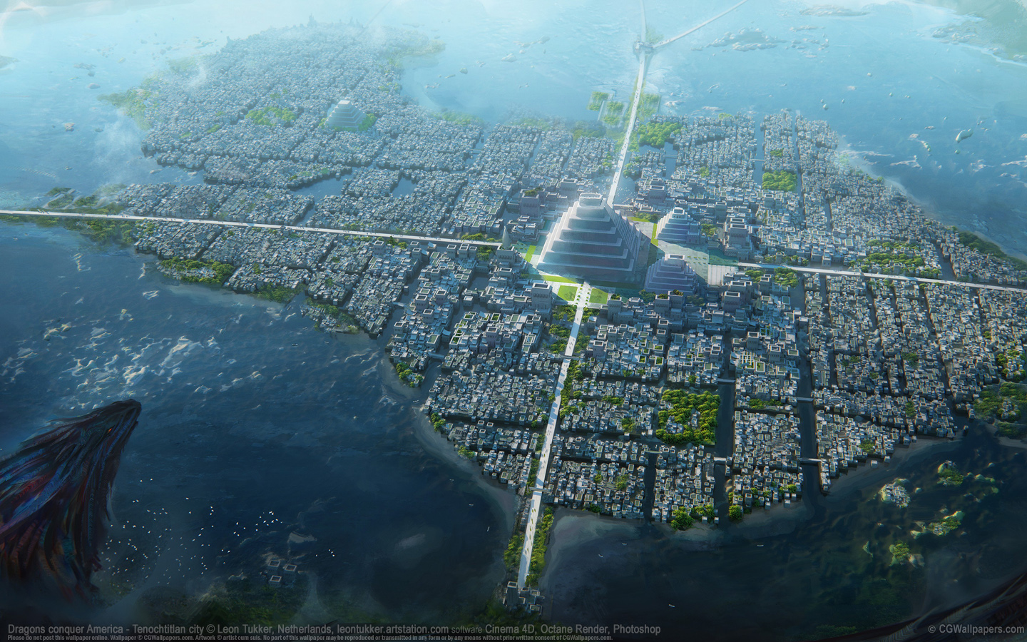 Dragons conquer America - Tenochtitlan city © Leon Tukker, Netherlands software Cinema 4D, Octane Render, Photoshop