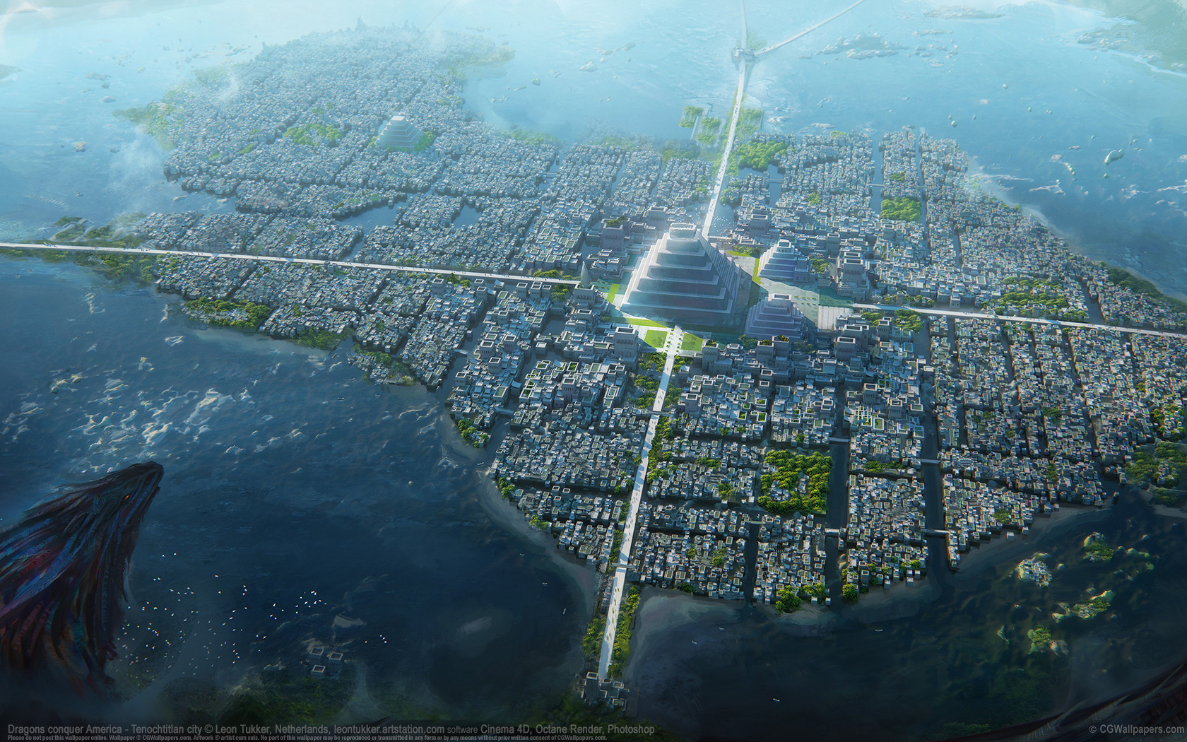 Dragons conquer America - Tenochtitlan city © Leon Tukker, Netherlands software Cinema 4D, Octane Render, Photoshop